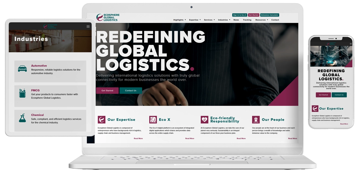 To enhance their brand presence, Ecosphere's brief was for a fresh, modern logo that embodies their commitment to eco-friendliness and technology, along with a responsive website. This new website features robust integrations for news updates, web forms, and an emissions calculator, ensuring users have access to essential information and tools at their fingertips.